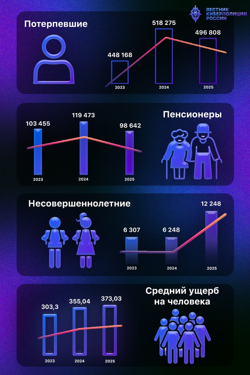 📉В уходящем году тренд впервые развернулся: количество потерпевших снизилось. 📉В 2024 году число потерпевших пенсионеров увеличилось на 15,5% по сравнению с 2023 годом. В 2025 году зафиксировано заметное снижение — почти на 17,4%, что связано как с техническими мерами, так и с адресной профилактической работой. 📈Иная динамика с несовершеннолетними потерпевшими. В 2024 году показатель почти не изменился (снижение менее чем на 1%), однако в 2025 году количество пострадавших несовершеннолетних выросло почти вдвое. Это указывает на смещение фокуса мошенников в сторону молодежи и цифровых схем, ориентированных на подростков. 📈Даже при снижении числа потерпевших финансовые потери продолжают расти. Средний ущерб увеличился на 17% в 2024 году и ещё примерно на 5% в 2025-м. Это говорит о том, что схемы становятся более «точечными» и более «дорогими» для жертв. Таким образом, количество преступлений и количество потерпевших начинает снижаться, но структура рисков меняется: давление смеща