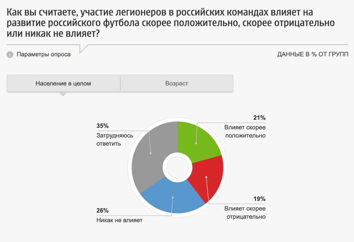 В российских футбольных клубах задействованы иностранные игроки (легионеры). По данным опроса ФОМа, 21% респондентов одобряет их участие, аргументируя это ростом профессионализма команд. Противоположной позиции придерживаются 19% граждан, полагая, что привлечение иностранцев препятствует развитию отечественных кадров. 26% опрошенных не видят влияния данного фактора. 57% респондентов считают более высокую оплату труда легионеров несправедливой, тогда как 18% признают ее справедливой. 36% респондентов считают, что в заявке футбольных клубов на матч должно быть не более 13 легионеров из 25, или же полагают, что иностранных игроков в российском чемпионате вообще быть не должно. 29% респондентов придерживаются противоположной точки зрения. 35% затруднились ответить на этот вопрос. Подробнее: fom.ru #спорт #футбол 📱 Фонд Общественное Мнение
