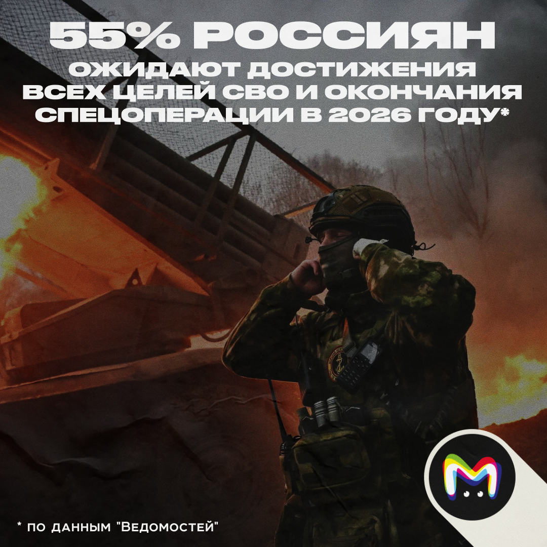 Достижение всех целей СВО стало главным ожиданием россиян на 2026 год, пишут "Ведомости" со ссылкой на доклад аналитического центра ВЦИОМ.