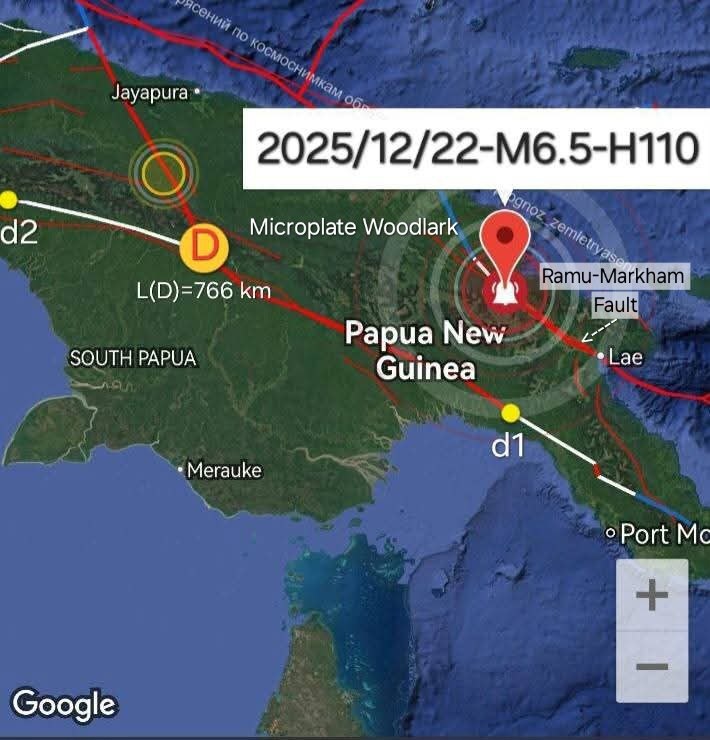 Легкая разминка по землетрясению (S) в Папуа - Новой Гвинее (ПНГ) 22/12/2025- Mw6.5 (вложение 1). Рассмотрим прогнозные признаки ЗТ (S) и его наиболее близких аналогов. 1) ОС (D)-трассер протяженностью 770 км. обнаружен на снимке со спутника AQUA 21/12/2025 (вложение 2), давший потенциальную магнитуду Мw6.6+-0.2. Магнитуда реального ЗТ Мw6.5, в пределах заданной погрешности метода расчета М. 2) Параметры СММ (1, 2) запуска ЗТ приведены на врезке композита 2 с прогнозными датами справа по -->. 3) Прогноз разработан совместно с А. Зеленоглазовым и выставлялся на его страничке в TELEGRAM-21/12/2025 (прим. здесь речь про данный канал). 4) В базе тематических продуктов автора по зоне ПНГ за период 2000-2025 гг. имеются композиты типовых ОС и СММ семи предыдущих мощных ЗТ магнитудами М7+. 5) По наиболее мощным ЗТ из пункта 4 отметим события 10/09/2022 - Мw7.6 и 08/09/2002 - Mw7.6. Их композиты ОС приведены во вложениях 3, 4. 6) Обратим внимание на текстурную идентичность ОС, трассирующи