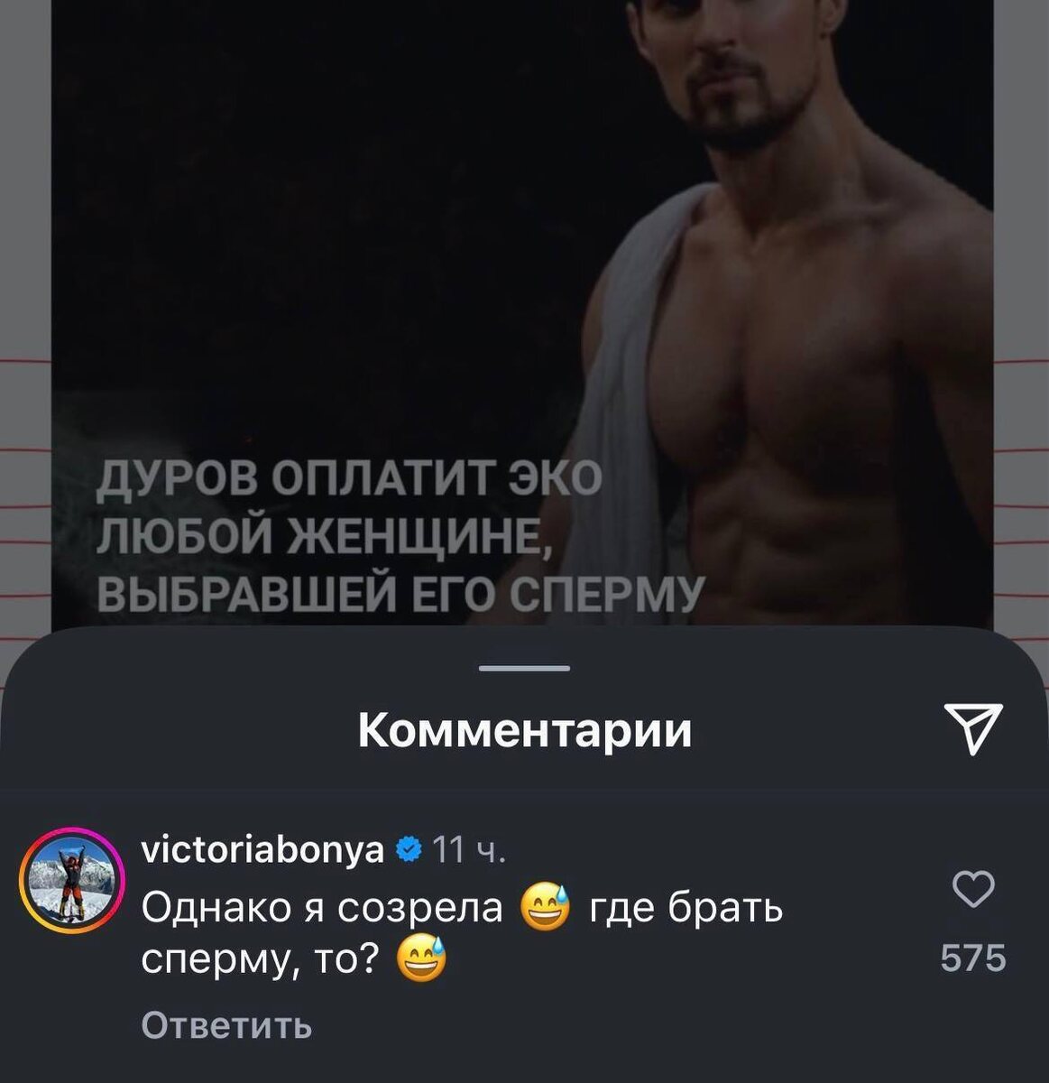 Хм, в какой из векторов развернуть наш дискурс? В сторону глубинных мотивов Павла Дурова или скудности и сомнительного качества яйцеклеток Виктории Бони? 🤔 Пысы: интересно, за чьей еще спермой гоняется Бонька? 💃