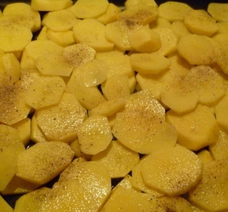 Картофель чистим, режем на тонкие пластины и укладываем на противень, смазанный маслом.