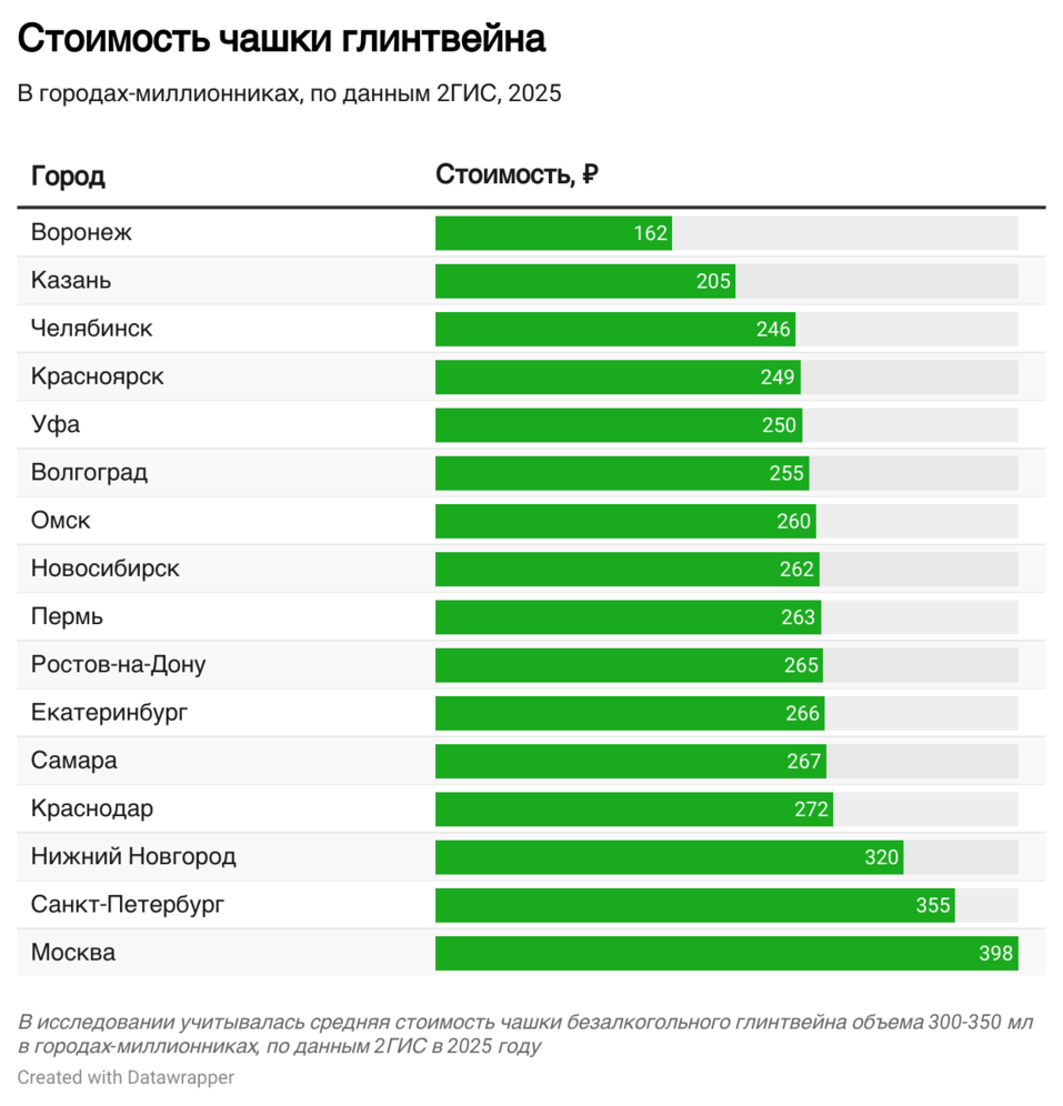 В 2025 г. в Нижнем Новгороде средняя стоимость чашки безалкогольного глинтвейна составляет 320 руб. Город вошел в тройку мегаполисов России по величине цены ароматного напитка, сообщается в исследовании 2ГИС. Дороже глинтвейн стоит только в Москве (398 руб.) и Санкт-Петербурге (355 руб.). Средняя стоимость напитка в российских городах-миллионниках равна 267 руб. Дешевле всего купить чашку глинтвейна получится в Воронеже — за 162 руб. По данным опроса глинтвейн стал вторым по популярности новогодним напитком: 72% россиян выбрали традиционное шампанское, а 17% — проголосовали за глинтвейн, — говорится в сообщении. В топ-5 городов с самыми низкими ценами также вошли Казань (205 руб.), Челябинск (246 руб.), Красноярск (249руб.) и Уфа (250 руб.). Как ранее писал NN.DK.RU, в Нижнем Новгороде число классических кофеен выросло на 24%.