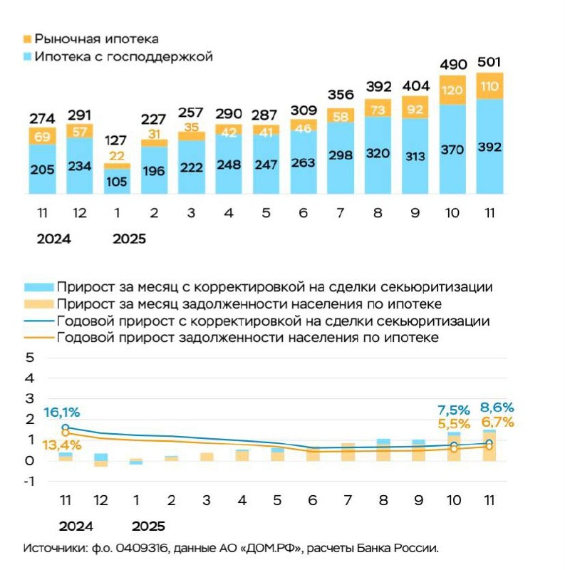 , увеличившись в ноябре на 1,4%. Основным драйвером роста стали кредиты с господдержкой, на которые пришлось около 80% новых выдач, при этом объём выдачи сохранился на уровне октября ~500 млрд рублей. 🛍 Естественно, наиболее популярной остаётся «Семейная ипотека», обьемы по которой выросли до 358 млрд рублей на новостях об ужесточении условий программы с 2026 года. В то же время рыночная ипотека остаётся очень умеренной (около 110 млрд рублей) из-за высоких процентных ставок, которые, несмотря на небольшое снижение до 19,5% годовых, продолжают сдерживать активность заёмщиков. ➡️Российский ипотечный рынок остается в состоянии перекоса: демонстрируя рост, полностью зависящий от государства, в рыночном сегменте он показывает стагнацию из-за высоких ставок. Финансовая нагрузка на население растёт, а зависимость рынка от бюджетных средств и краткосрочных факторов стала уже просто неприличной. 🧊Монолит