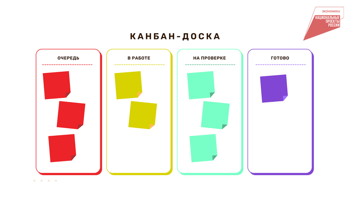 🏢 В рамках федерального проекта «Производительность труда» национального проекта «Эффективная и конкурентная экономика» предприятия-участники осваивают различные инструменты бережливого производства. Помимо методов оптимизации процессов, существуют и эффективные инструменты планирования. 📋 Для наглядного контроля за реализацией проектов отлично подходит инструмент «Канбан». Он позволяет видеть, на какой стадии находится каждая задача. Стадии (этапы) можно настраивать в зависимости от специфики задачи. Например, для организации корпоратива подойдут стадии: «В очереди» (задачи, не взятые в работу), «В работе», «На согласовании» (с руководством или подрядчиком) и «Готово». ❔ Как это применить? 1️⃣ Составьте список всех действий, необходимых для организации корпоратива. Каждое действие можно оформить как отдельную задачу. 2️⃣ Создайте Канбан-доску. Её можно сделать физически (на стене или пробковой доске) или в электронном виде (с помощью специальных программ). 3️⃣ Распишите задачи на