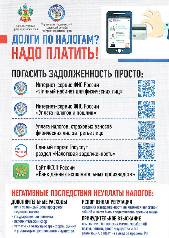 🚙 Межрайонная ИФНС России №21 по Краснодарскому краю напоминает о негативных последствиях неуплаты налогов Если физическое лицо не уплачивает налоги вовремя, налоговые органы применяют ряд мер для взыскания задолженности, которые регулируются Налоговым кодексом Российской Федерации (НК РФ). Так, сумма налога, не уплаченная в установленный срок, признается недоимкой. На сумму недоимки за каждый календарный день просрочки уплаты налога начисляются пени. Задолженность может быть взыскана налоговым органом в установленном порядке. Узнать информацию о размере задолженности, а также оплатить её можно с помощью сервисов «Личный кабинет для физических лиц» на сайте ФНС России, Единый портал государственных услуг, а также при личном визите в налоговом органе. Своевременная уплата налогов позволяет избежать многих негативных последствий, таких как: 🔵начисление пеней; 🔵необходимость уплаты госпошлины и исполнительного сбора; 🔵удержание долга из заработной платы или пенсии либо иных перио