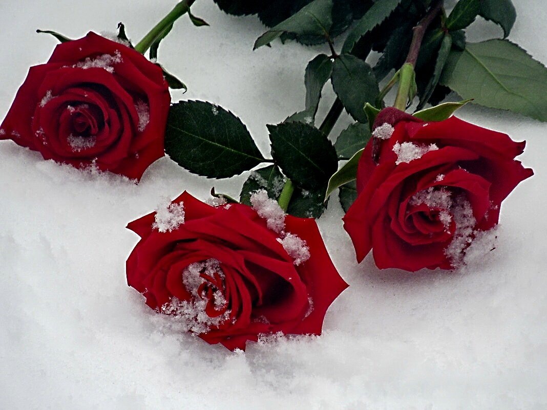 Алые розы лежат на снегу