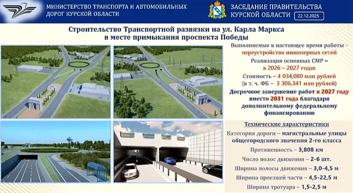 К 2027 году в Курске появится новая развязка на проспекте Победы стоимостью 4 млрд рублей. Ранее предполагалось завершить строительство транспортной артерии в 2031 году. Ускорение стало возможным, благодаря федеральному финансированию. Проект протяжённостью 3,8 км с полосами шириной до 4,5 метров призван ликвидировать заторы в узле,где сходятся проспект Победы, улица Росинка и две части улицы Карла Маркса. Строительство начнётся в 2026 году, а подготовительные работы по переносу коммуникаций уже ведутся с осени 2023 года.Впрочем, куряне отмечают, что это не единственная транспортная артерия Курска, требующая развязки: Телекомпания «ТАКТ» в Max