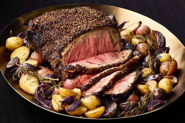 То есть запеченный кусок говядины в специях для пастрами. Кусок говядины для запекания, 2 кг с небольшим 5 ст.л. семян кориандра 5 ст.л. черного перца горошком 1,5 ст.л. копченой паприки 0,5 ч.л. острого красного перца (ну или больше, если хотите острее) 0,5 стакана кленового сиропа (или тутового дошаба, или меда) Соль Оливковое масло Гарнир 1 кг картошки 2 больших луковицы 6-8 веточек розмарина Оливковое масло Соль Кориандр и черный перец обжарьте, потолките в ступке довольно крупно, смешайте с паприкой и парой столовых ложек соли. Говядину зачистите от жира (если он есть), смажьте сиропом-медом, смешанным с острым перцем. Присыпьте со всех сторон смесью специй и отправляйте в холодильник, не накрывая, минимум на 8 часов, а лучше сразу на сутки. Выньте мясо из холодильника за час до готовки, чтобы согрелось. Перемешайте картошку с луком, порезанным на четвертинки, розмарином, оливковым маслом. Посолите. Разложите на противне, уложите сверху мясо. Запекайте 15 минут при температу