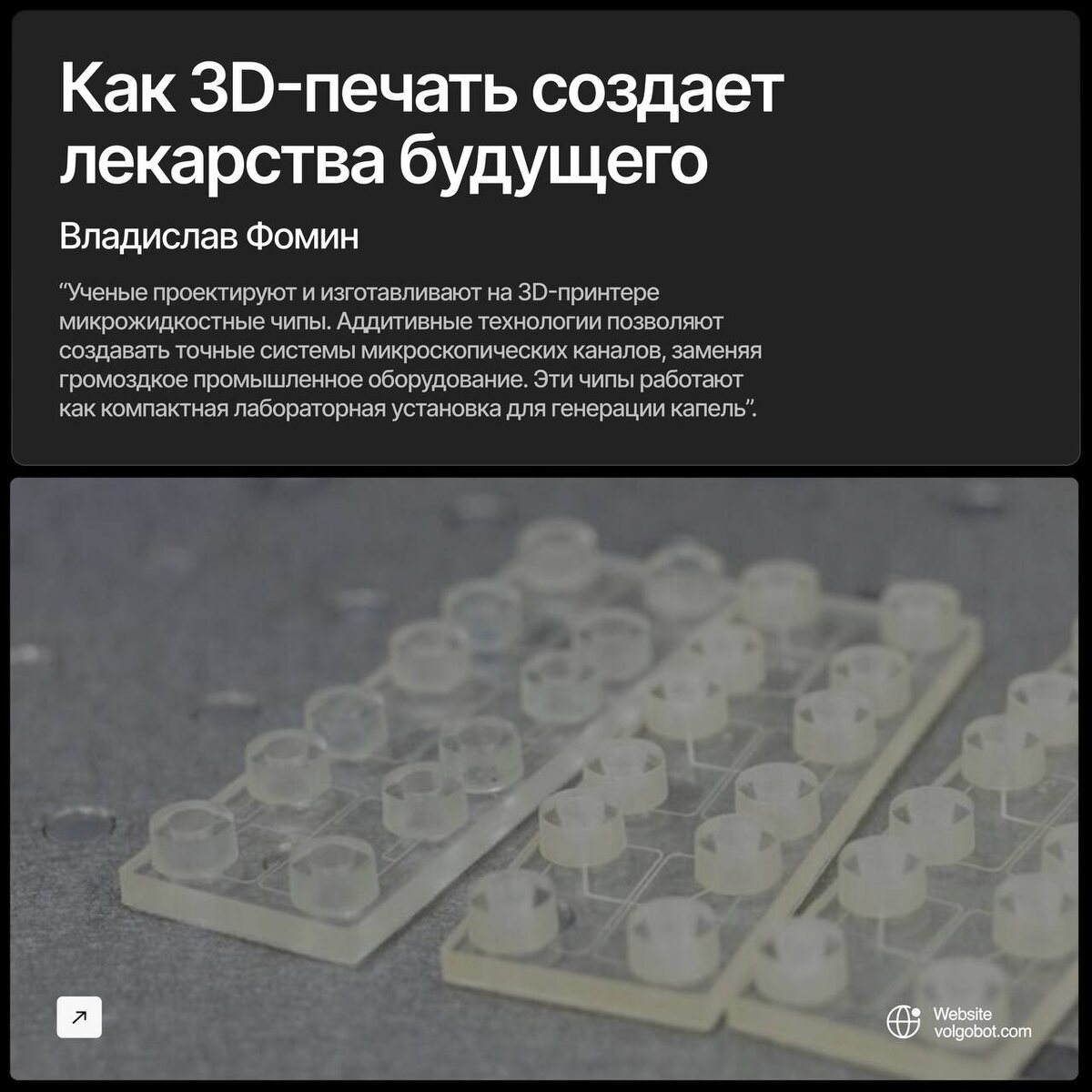 Сегодня в рубрике «Новости мира 3D-печати». Рассказываем, как ученые Сургутского государственного университета с помощью аддитивных технологий создают микрокапсулы с экстрактами целебных растений Севера. Эта технология позволяет защитить активные вещества и использовать их в медицине и пищевой промышленности. Процесс создания микрокапсул происходит следующим образом: 1. 3D-печать чипа: Ученые проектируют и изготавливают на 3D-принтере микрожидкостные чипы. Аддитивные технологии позволяют создавать точные системы микроскопических каналов, заменяя громоздкое промышленное оборудование. Эти чипы работают как компактная лабораторная установка для генерации капель. 2. Формирование эмульсии: Через микроскопические каналы чипа подаются жидкости, создавая эмульсию на основе растительного масла. 3. Инкапсуляция: В эмульсию вводится экстракт растения, а с помощью гелеобразующего компонента вокруг него формируется прочная защитная оболочка — готовая микрокапсула. Метод позволяет работать с р