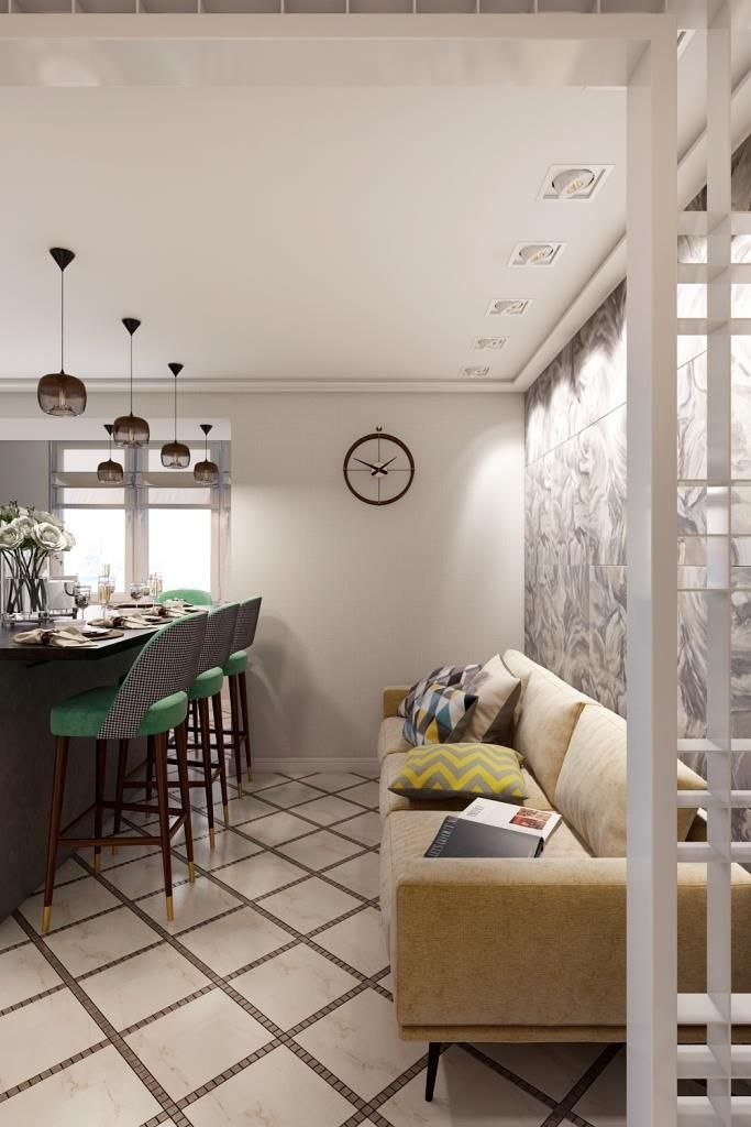 Достаточно спокойный, современный интерьер, наполненный яркими текстильными акцентами, с включением графики в отделке. Керамическое акварельное панно привносит в интерьер живость и настроение, тем самым украшая его. Проект - #АЧ_Функциональный_Аспект