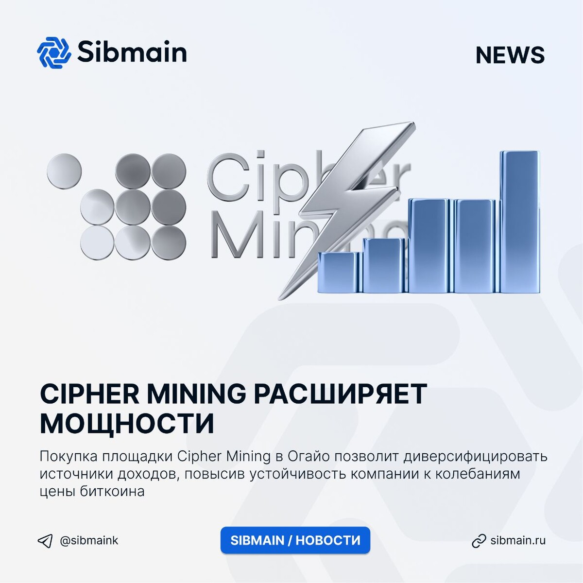📰📰📰📰 ➡️Cipher Mining расширяет мощности Американский майнер Cipher Mining объявил о покупке в штате Огайо площадки мощностью 200 МВт для расширения мощностей. Площадку планируют задействовать: ⏺️В майнинге первой криптовалюты; ⏺️Обеспечивая высокопроизводительные вычисления; ⏺️Для хостинга дата-центров 📍Покупка площадки Cipher Mining в Огайо позволит диверсифицировать источники доходов, повысив устойчивость компании к колебаниям цены биткоина