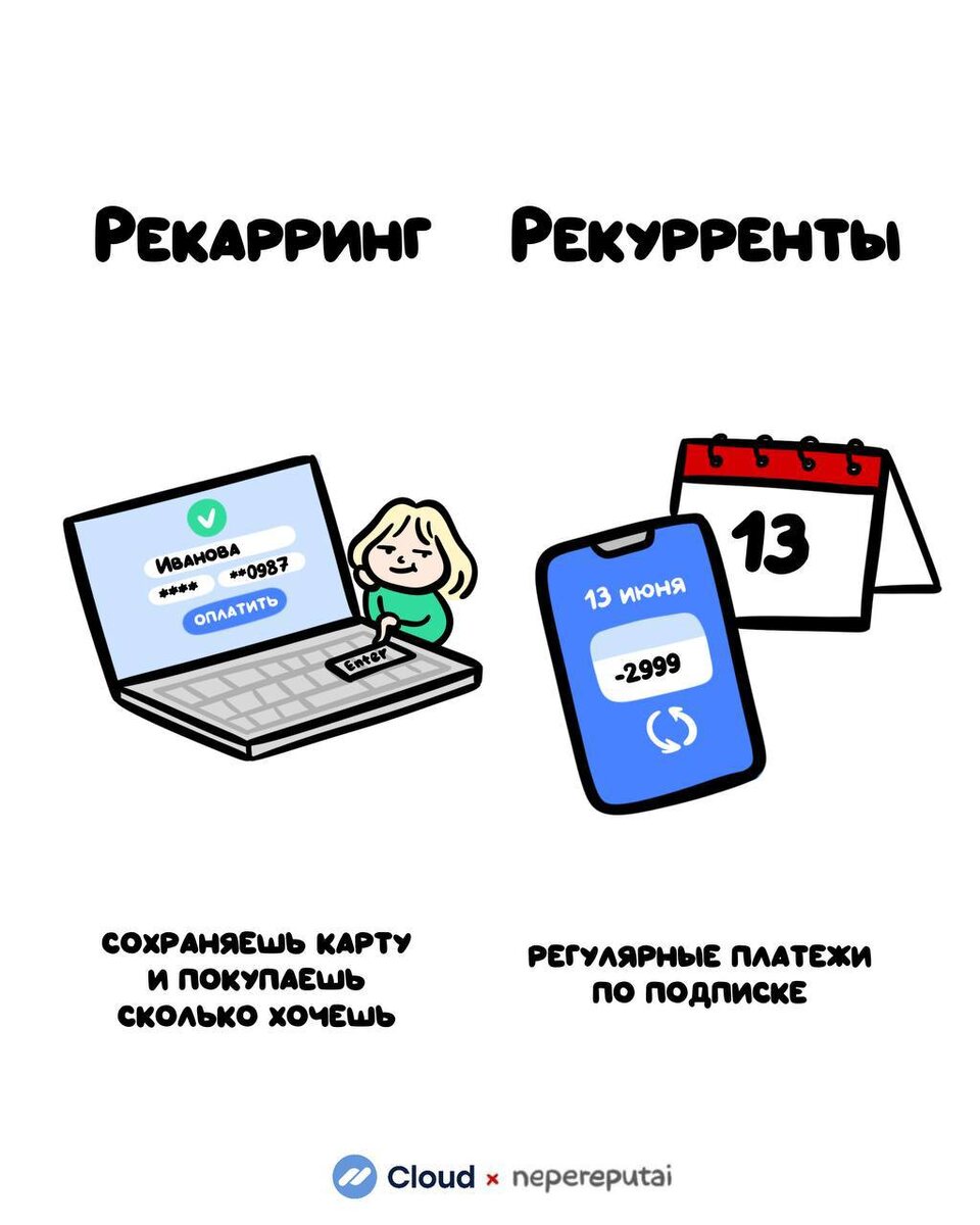 похожи по названию, но в бизнесе решают разные задачи ➡Иногда нужно, чтобы клиент платил по расписанию. ➡А иногда — чтобы он возвращался за повторными покупками. Вот где начинается путаница↪️ 🔵Рекарринг, она же токенизация, или «оплата в один клик» В этом способе карта клиента сохраняется в виде токена — то есть данные карты «упакованы» и безопасно хранятся, а вы дальше работаете с токеном. Представьте приложение доставки еды — вы один раз оплатили заказ, ввели данные карты, а при следующем заказе: *тык* → оплатилось. Без «введите номер карты», «смс-код», «ой, я не помню CVV» — это удобно и повышает платёжную конверсию. Что важно: при рекарринге вы управляете списаниями сами. Каждое списание — это ваш запрос по API. Вы же отвечаете за логику: когда списывать, как уведомлять, как отменять. 🔵 Рекурренты, они же автоплатежи, или подписки Тут вы работаете с подписками: задаёте сумму, период, дату — и дальше списания идут автоматически по расписанию, а с токенами уже работает Clou