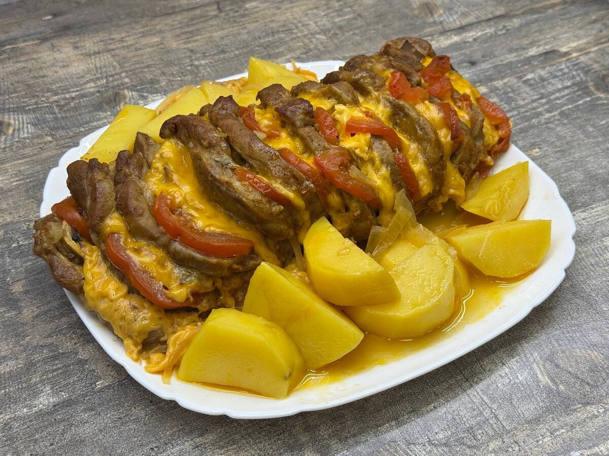 Свинина, запечённая «гармошкой», — это блюдо, которое всегда выглядит эффектно, а готовится при этом гораздо проще, чем кажется на первый взгляд. Я часто выбираю такой вариант, когда хочется приготовить что-то сытное и праздничное, но без сложных соусов и долгой возни на кухне. Мясо получается сочным, ароматным, с румяной корочкой, а начинка из сыра, помидоров и грибов делает каждый кусочек насыщенным и вкусным. Для начинки: Дополнительно: Начинаю с мяса. Свиную шею промываю, обсушиваю бумажными полотенцами и нарезаю пластинами толщиной примерно 1 см. Важно не дорезать до конца — мясо должно раскрываться, как гармошка, оставаясь цельным куском. Такая нарезка позволяет начинке равномерно распределиться, а мясу — сохранить сочность при запекании. Для маринада в небольшой миске смешиваю оливковое масло, измельчённый чеснок, паприку, соль и чёрный перец. Получившейся смесью тщательно натираю мясо, уделяя внимание каждому разрезу. Именно в этих местах мясо особенно хорошо впитывает аромат