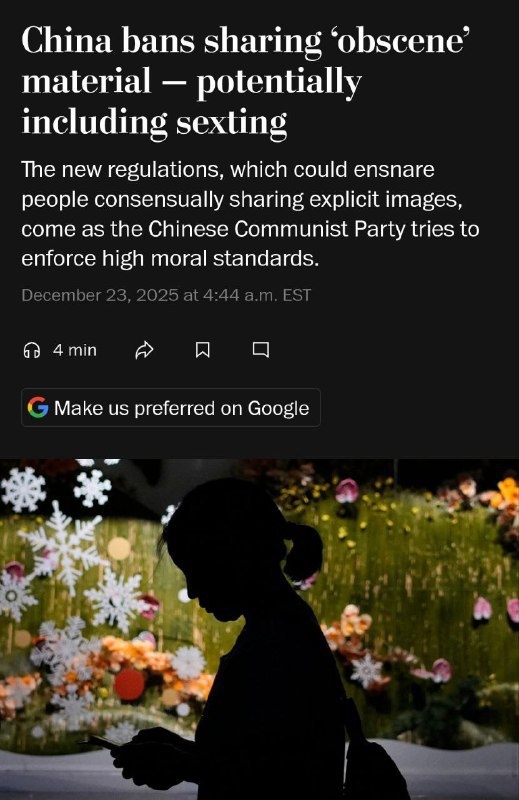 Под запрет попадает любой «непристойный» контент — не только в публичке, но и в личных переписках. Наказание стандартное: изолятор + штраф около $700. Формулировки максимально размытые — теоретически под закон может угодить даже интим между взрослыми по обоюдному согласию. Товарищ, держи руки при себе 🇨🇳🇨🇳 Подробнее: https://hard-tm.su/threads/136496/ 🕹HARD-TM — Подписаться