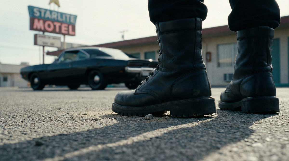 Черный тонированный «Додж» подкатил к мотелю. Открылась дверь, черные массивные армейские ботинки уверенно ступили на землю. Шаг был твердым. С каждым метром, приближающим его к мотелю, по походке было видно, что человек знает себе цену. Массивный кулак постучал в дверь с цифрами 104. Спустя минуту дверь открылась.