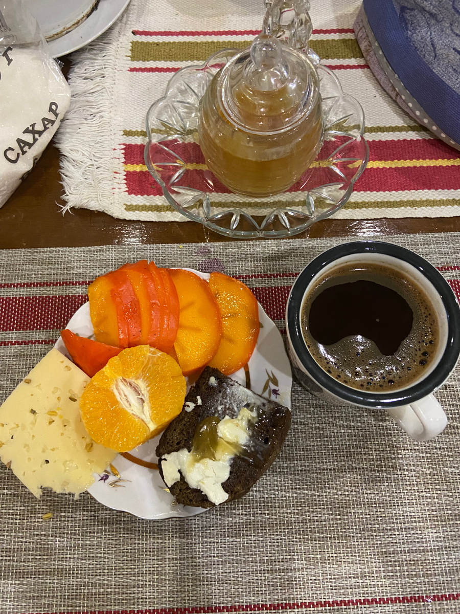 На завтрак сегодня у нас хурма, мандарин, кофе и кусочек хлеба с маслом и мёдом. Маленькие радости после большого пути.