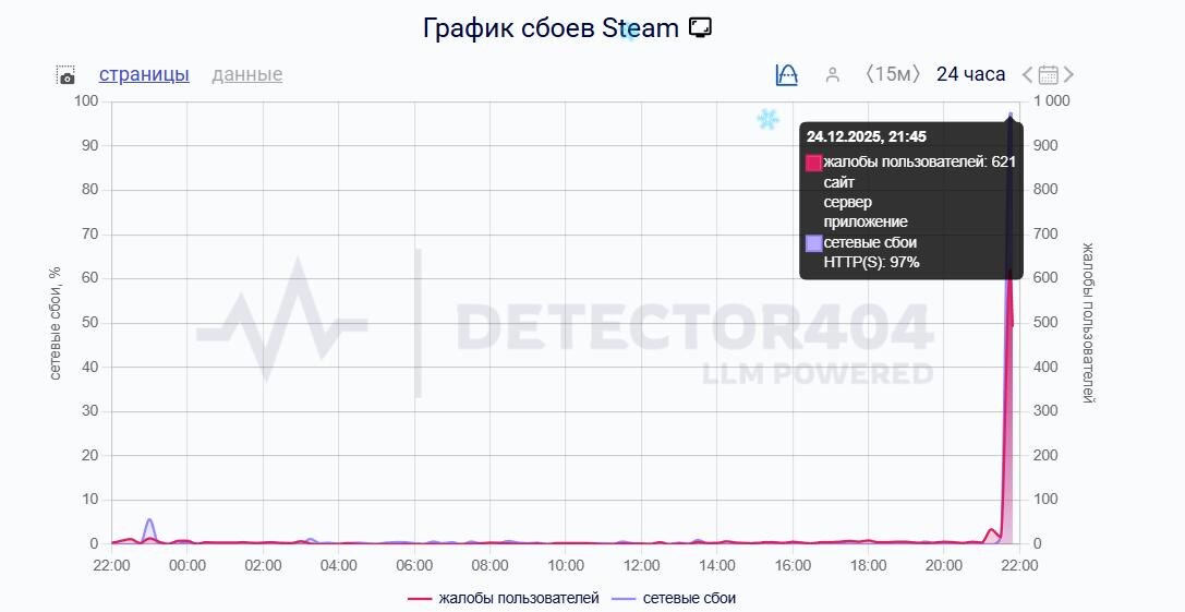 Вечером среды у россиян перестал загружаться Steam, чаще всего пользователи жалуются на проблемы с входом на сайт и в личный кабинет, сообщает Downdetector. По информации сервиса, больше всего обращений поступает из Карелии, Санкт-Петербурга и Новосибирской области. Пик жалоб зафиксирован в 21:45, однако причина неполадок не уточняется. Проблемы в работе Steam зафиксировал и сервис «Сбой.рф», по данным которого по числу жалоб лидирует Москва, Петербург и Свердловская область. На днях «Петербургский дневник» также сообщал о сбое в работе приложения РЖД, из-за которого пассажиры не могли купить билеты.