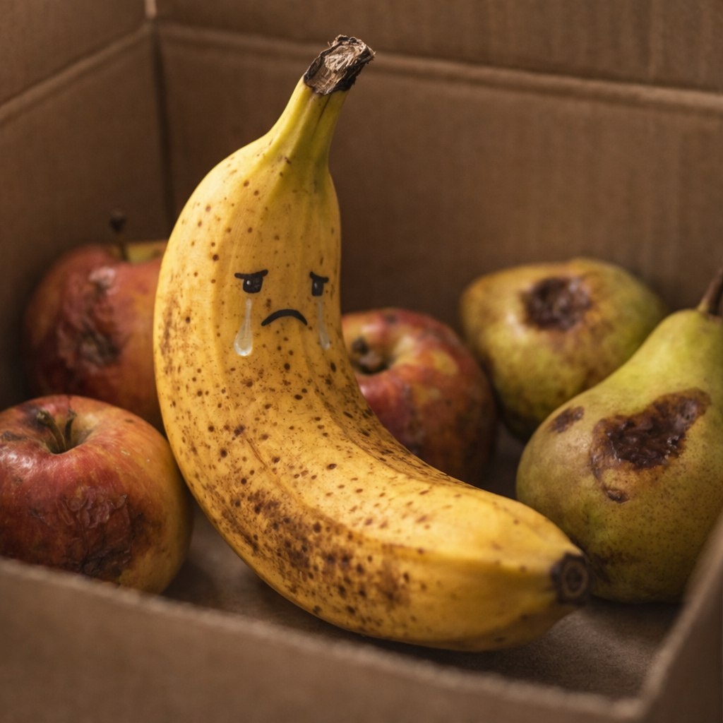 Утром человек в зеленом фартуке переложил банан с крапинкой в ящик уценки. От такого унижения бедняга покрылся крапинками с ног до головы. Его соседи, побитые яблоки и груши, окончательно смирились с мыслями о том, что им придется закончить свой путь на помойке. Банан же не мог ни о чем думать, он просто был в шоке!
