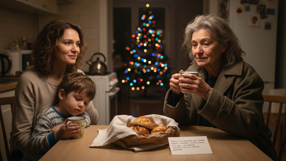 Мы усадили Тимку рядом. Дали ему маленькую кружку с тёплым напитком. Он ел булочку и слушал, как Лидия рассказывает — совсем тихо — про то, как раньше любила встречать Новый год.