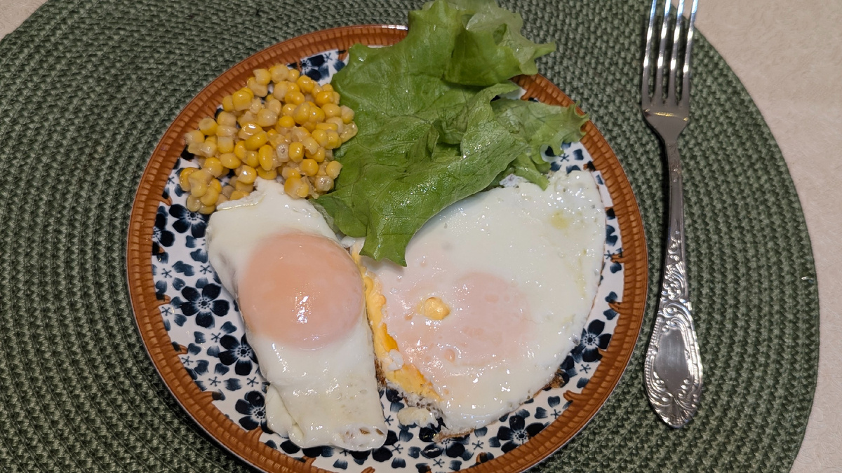 Жёлтые солнышки-желтки в обрамлении белых облачков белка, присыпанные сочной кукурузой и изумрудными листьями салата.