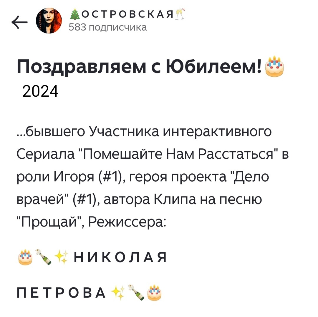 К сожалению, Николай о поздравлении не узнал, так как Интересантом Островской не является и Салон не посещает, в связи с чем снят с роли в иммерсиве, Дело врачей прекращено.