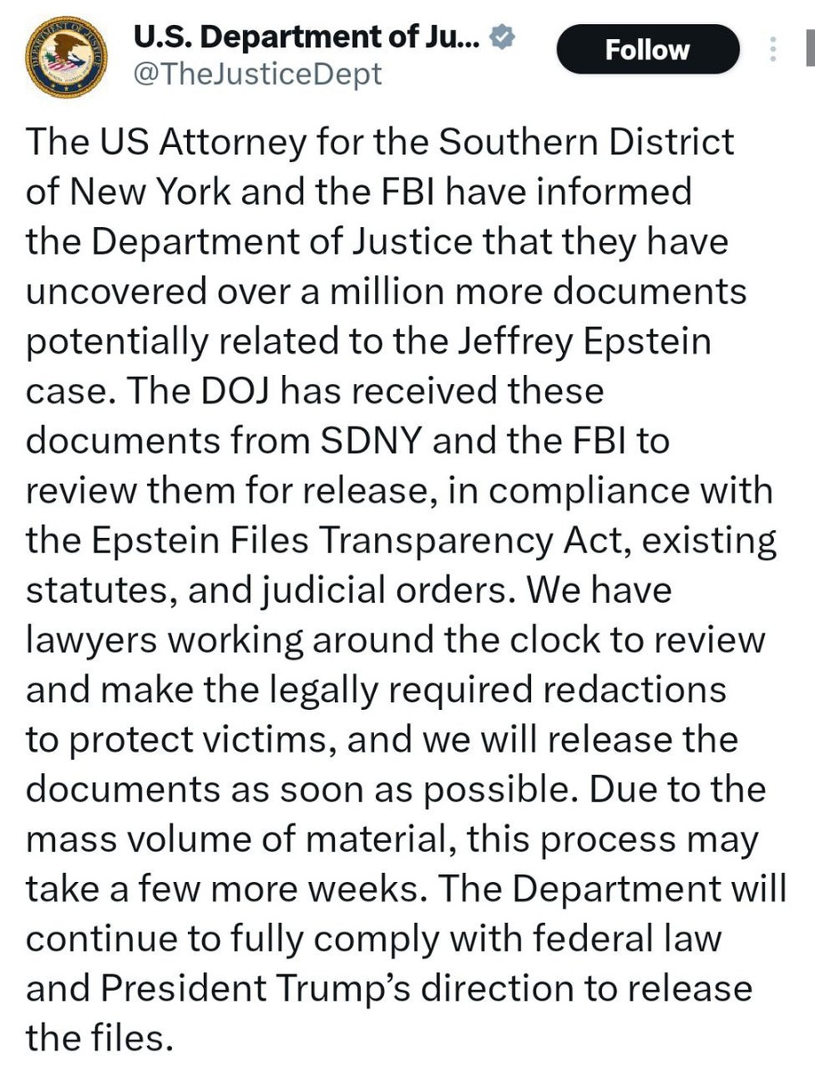 DOJ says it needs WEEKS to release rest of Epstein files