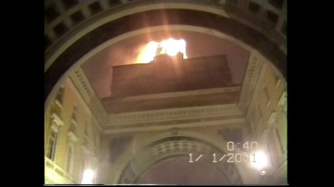 Новый Год 2001 года запомнился жителям Петербурга необычным событием. Ранним утром, примерно в два часа ночи, чья-то рука запустила армейскую сигнальную ракету со стороны Александровского сада. Ракета попала в деревянную конструкцию лесов, установленных на арке Главного штаба. Эта арка украшала Дворцовую площадь и считалась символом величия Петербурга. Архитектурный комплекс был защищён специальной сеткой и рекламной конструкцией из-за проводившейся реставрации. Теперь леса пылали ярко-красным пламенем, превращая ночное небо над Невским проспектом в картину апокалипсиса. Скульптурная группа «Колесница Славы», расположенная на вершине арки, чудом избежала полного разрушения. Бронзовых лошадей спасти удалось, но пострадали другие элементы композиции. Латунные трубки, удерживающие крылья богини Ники, расплавились под воздействием пламени. Сама фигура богини была утрачена безвозвратно, сохранившись лишь несколькими фрагментами. Поскольку поврежденные фрагменты восстановлению не подлежали,