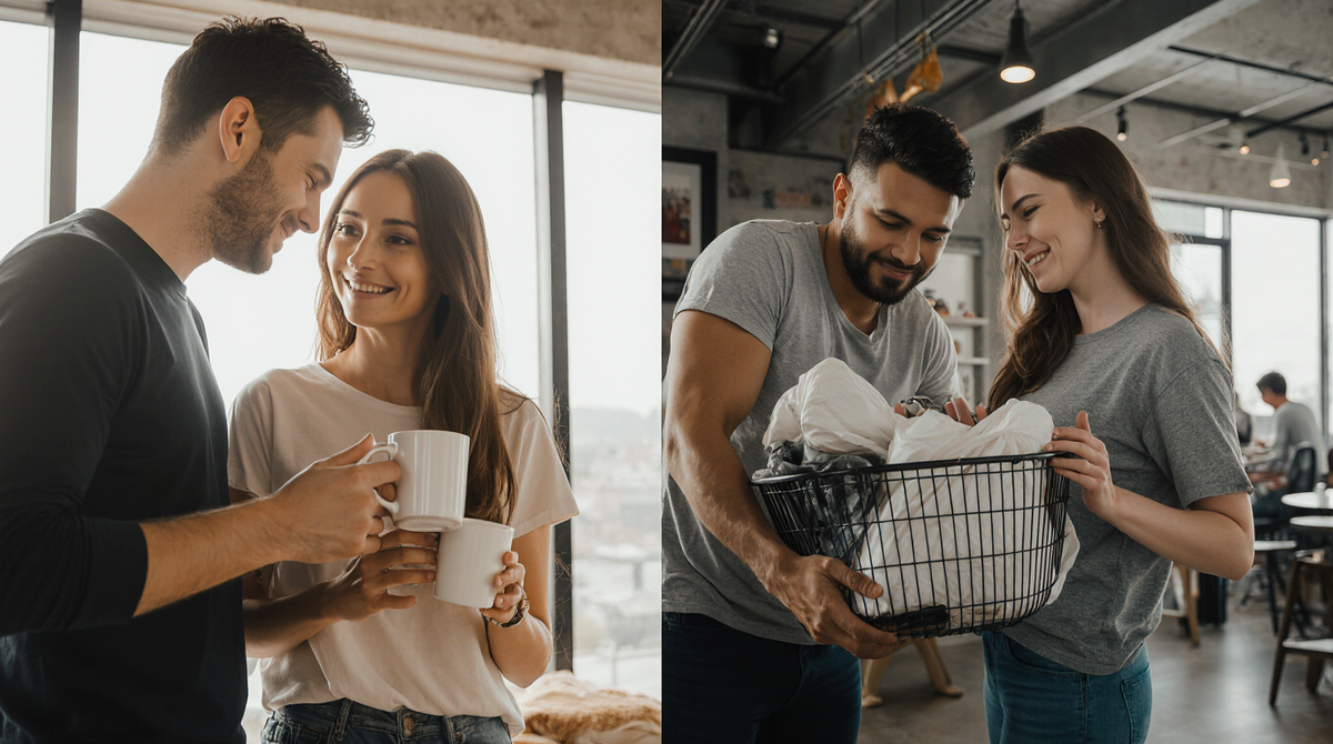 Представьте типичную сцену в торговом центре: пара выбирает диван. Через 15 минут он смотрит в потолок, она яростно листает каталог, а продавец пытается сохранять профессиональное спокойствие. Кажется, они на грани срыва. А теперь другая сцена: та же пара на фермерском рынке. Он пробует сыр и кормит её с ложечки, она смеётся, выбирая странный фрукт. Они кладут покупки в одну сумку и уходят, держась за руки.