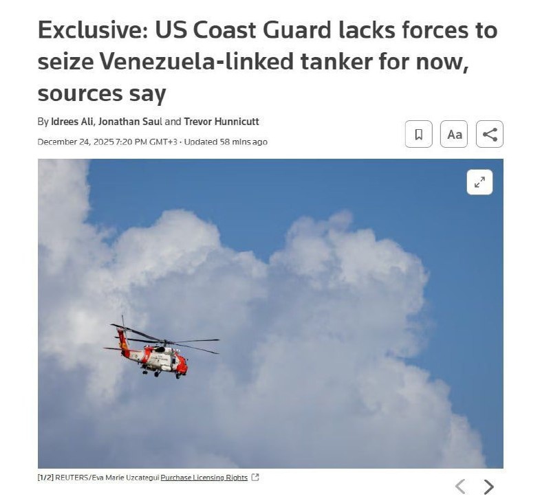 👉👉👉"Береговая охрана США пока не может захватить связанный с Венесуэлой нефтяной танкер " Bella 1", потому что у неё не хватает