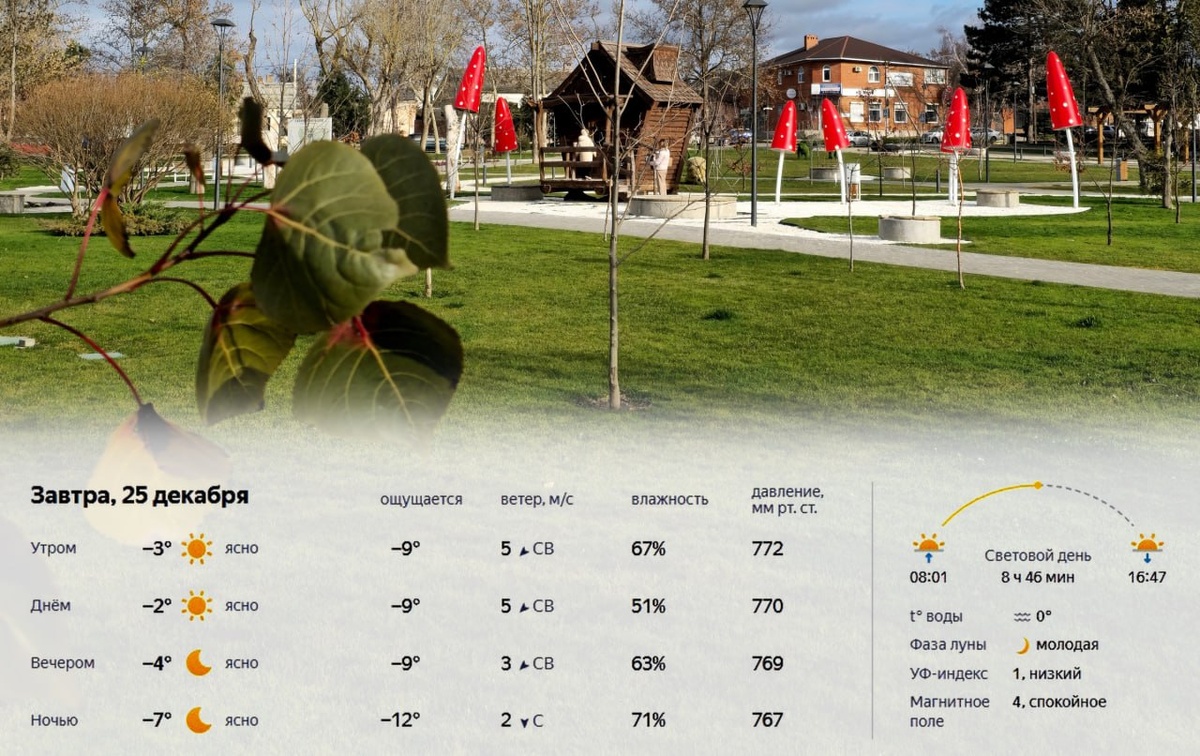 В четверг, 25 декабря, в Краснодаре ожидается морозная и ясная погода. Утром около −3°, из-за ветра будет казаться значительно холоднее. Днём до −2° при ясном небе и северо-восточном ветре. Вечером температура понизится до −4°, ночью похолодает до −7°. Световой день продлится 8 часов 46 минут, восход в 08:01, закат в 16:47. Температура воды 0°, УФ-индекс низкий, магнитное поле спокойное. Подробнее: https://краснодарскийкрай.рф/news/prognoz-pogody-v-krasnodare-na-25-dekabrja-2025-goda.html Прогноз погоды на неделю: https://краснодарскийкрай.рф/pages/weather-forecast.html #погода #прогнозпогоды #температура #осадки #ветер #климат #метеопрогноз #метеосводка #краснодар #краснодарскийкрай #krasnodarregion