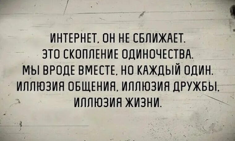 Нам нужно не больше общения. Нам нужно другое качество общения. Нужно сменить парадигму - с «быть на виду» на «быть увиденным». С «много знать о людях» на «глубоко чувствовать кого-то».