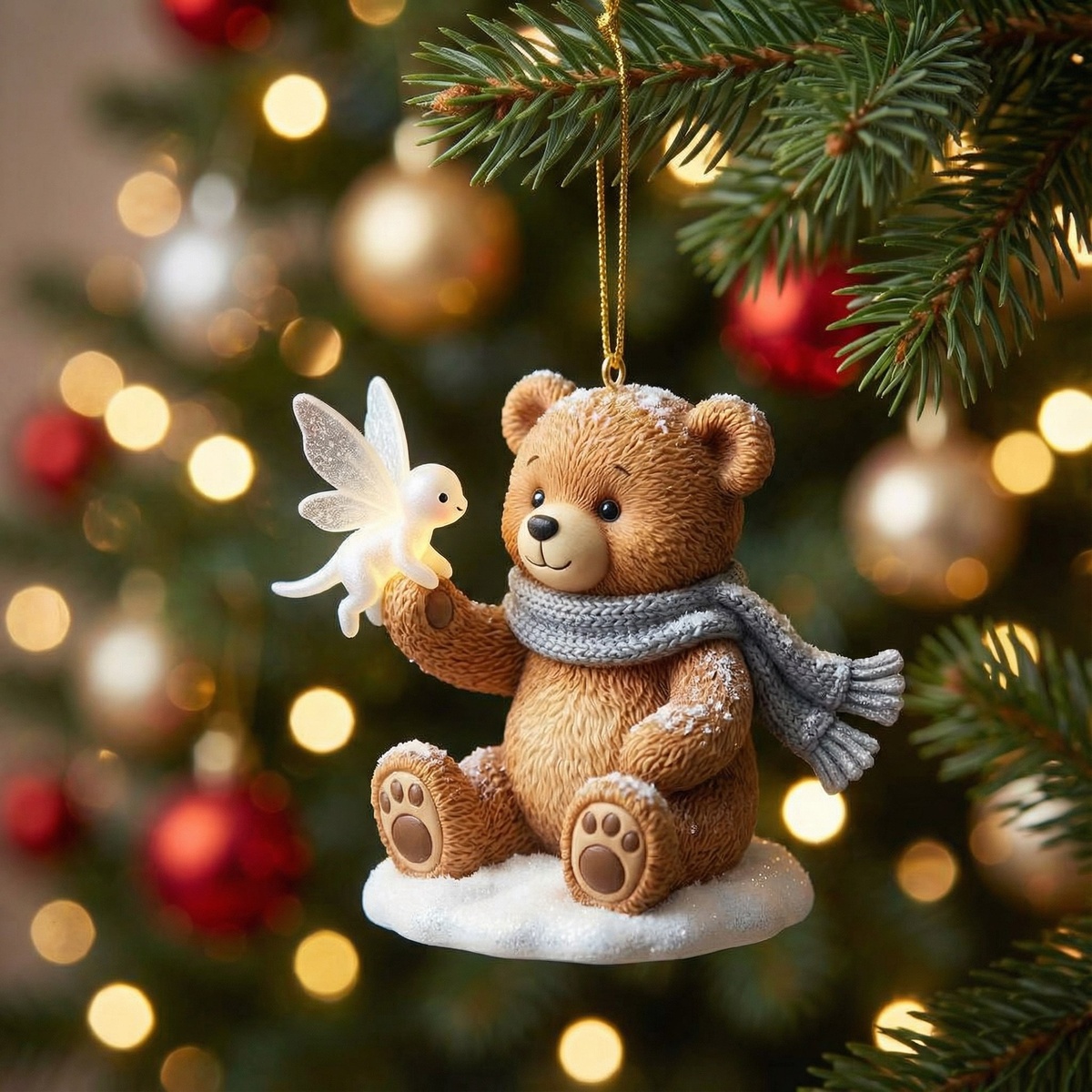 Однажды в маленьком уютном городке стояла старая мастерская игрушек. Там жила одна особенная елочная игрушка — маленький деревянный медведь, вырезанный мастером-краснодеревщиком много лет назад. Медведь был сделан из теплого коричневого дерева, покрытого золотистыми блестками, и имел веселые глазки-кнопочки.