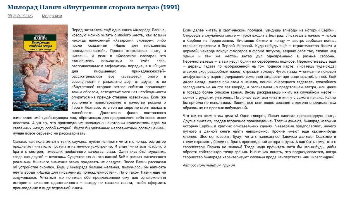 Милорад Павич "Внутренняя сторона ветра" (1991) | Критика