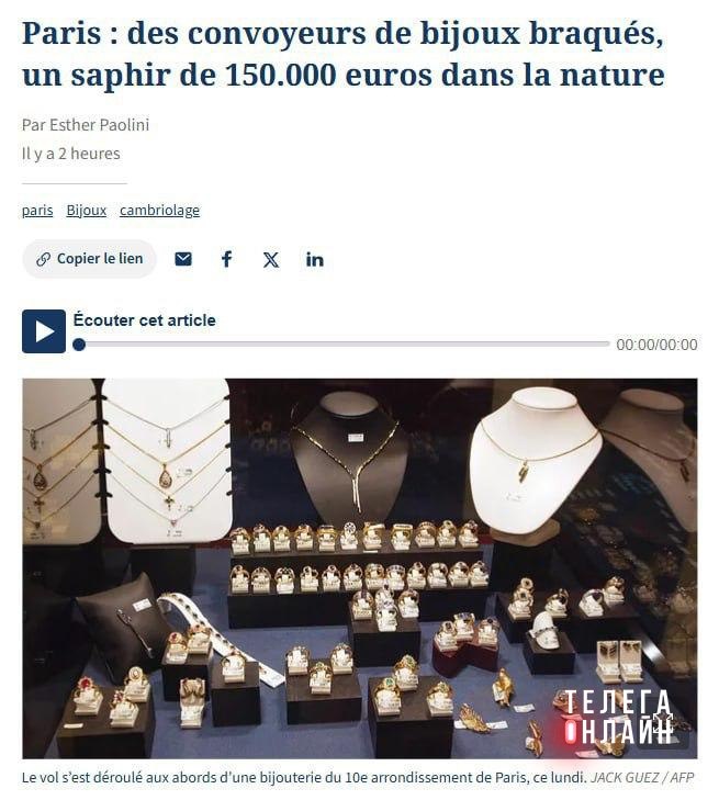 У инкассаторов в Париже украли пять пакетов с ювелирными изделиями и золотом, в том числе сапфир стоимостью €150 тыс. Одного из инкассаторов преступник ударил кувалдой по голове, после чего скрылся на скутере. Как же хороша, а главное безопасна Франция при Макроне! 🚲 Подпишись на Телега Online