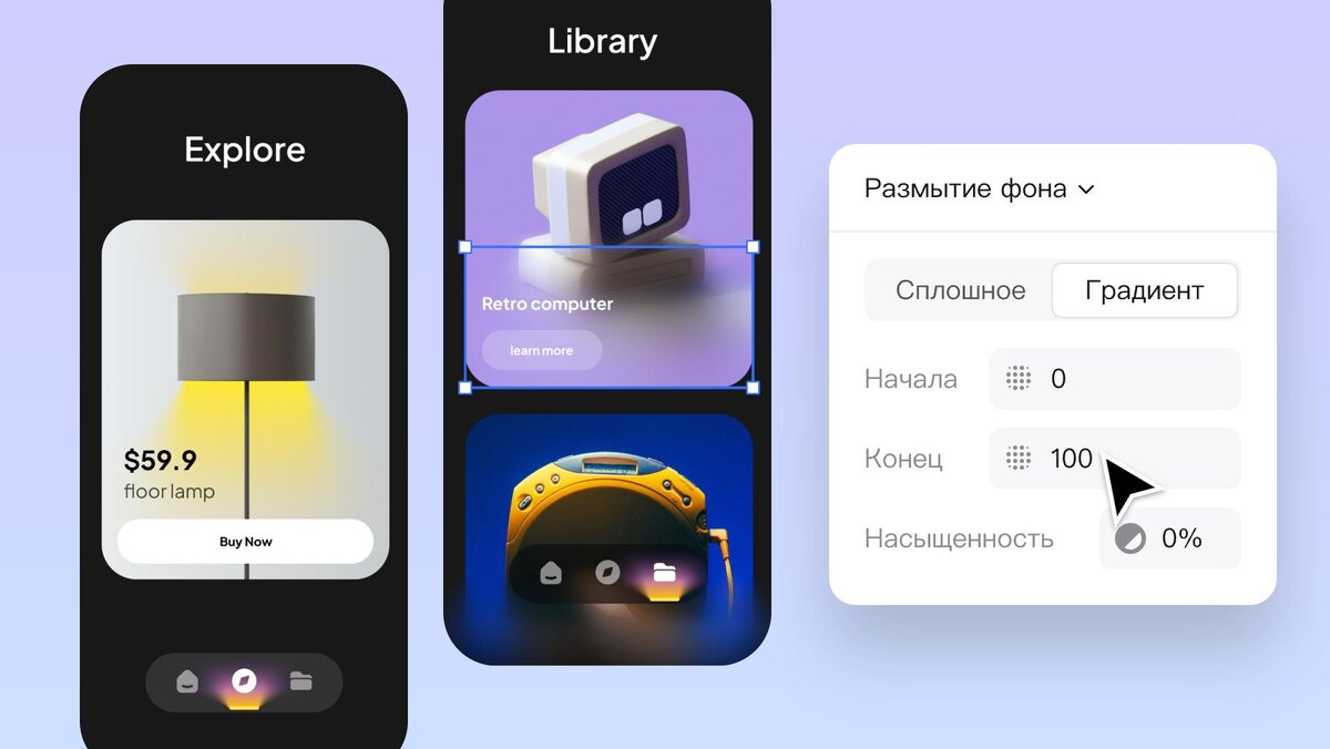 💪 В Pixso теперь у Gaussian blur и Background blur есть возможность размывать по градиенту, например от 0 до 100%, тем самым придавать удобное размытие не на весь элемент.