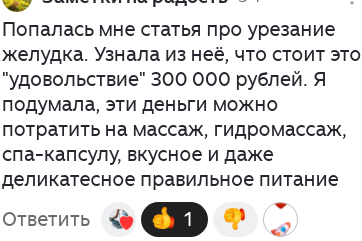 что стоит это "удовольствие" 300 000 рублей. Я подумала, эти деньги можно потратить на массаж, гидромассаж, спа-капсулу, вкусное и даже деликатесное правильное питание" - разбираю комментарии читателей, которые накопились за неделю, и встретила мнение: - это коммент к статье: Ведь это же очень логично! Огромное количество людей пишут о том, что я бы похудела, но вот деньги... Денег нет. А здесь тебе говорят - на, бери, вот 300 тыс., трать на себя, радуй себя, заботься о себе. Часто тут может последовать ответ, что я эти деньги беру в кредит. У меня их нет. Но, оказывается, возможности изыскать можно. В кредит, но можно. которое возникнет у читателей: как же так! психолог и не понимает простых вещей! ведь так нельзя сравнивать! Нельзя сравнивать! - Про что эта эмоция? Почему нельзя сравнивать и ЧТО мы сравниваем? Во-первых, мы сравниваем деньги - 300 тыс. рублей, которые остаются неизменными и в сценарии №1 (операция), и в сценарии №2 (забота о себе). Во-вторых, мы сравниваем спосо
