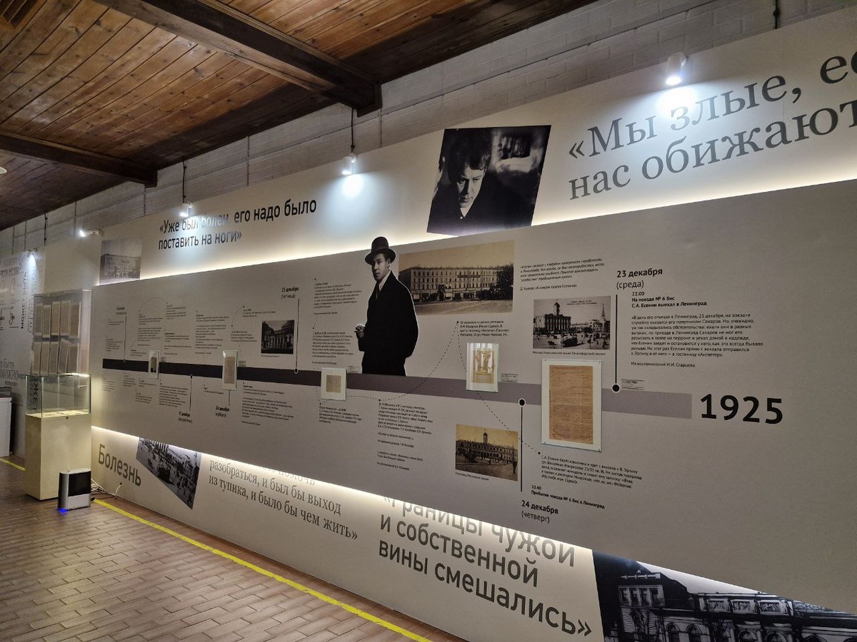24 декабря 1925 года Сергей Есенин приехал в Ленинград, через несколько дней поэта не стало. С кем он виделся, о чём говорил, что случилось 28 декабря в гостинице «Англетер»? Выставка-расследование, которая открылась в музее-заповеднике Есенина к столетию гибели поэта, погружает в контекст трагедии и отвечает на чать вопросов. Проект беспрецедентный: впервые представлены все доступные материалы о трагических событиях столетней давности. Архивы открыли не только 13 музеев страны, но и ФСБ. Организаторы собрали десятки подлинных документов, рукописей, фотографий и экспертиз разных лет, чтобы посетители выставки сами ответили на вопрос: «Что это было? Трагическое решение поэта или всё-таки убийство?» Версий о причинах случившегося больше двух, и всем нашлось место в экспозиции. «Расследование» начинается с импровизированного вокзала. Четыре чемодана не для красоты, столько было в багаже поэта. После документов о здоровье и отношениях с властью, следует таймлайн с мельчайшими подробностям