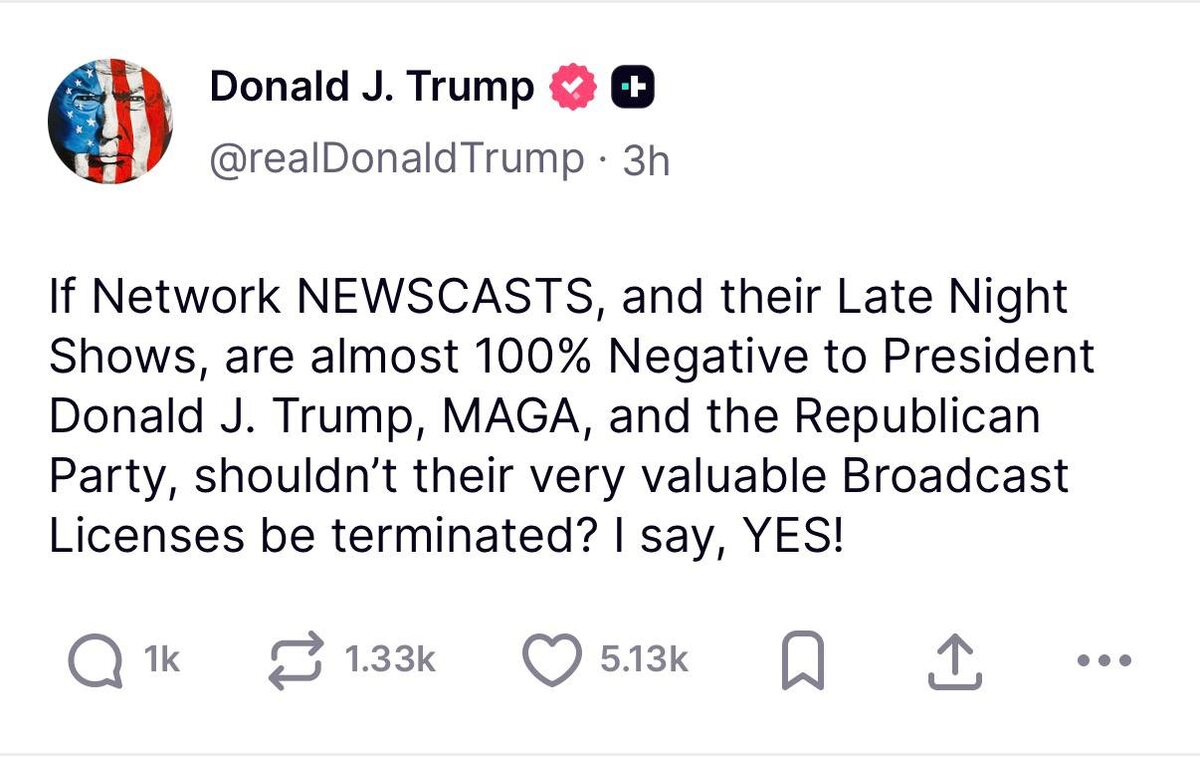 Дональд Иванович призвал лишать лицензий СМИ, чья политика направлена против него и его компашки. Если новостные каналы и их вечерние шоу почти на 100% негативно относятся к президенту Дональду Трампу, движению MAGA и Республиканской партии, разве не следует ли аннулировать их очень ценные лицензии на вещание? Я говорю: ДА! Мы оказались в той параллельной вселенной, где люди, учившие несколько лет назад нас жить, оказались педофилами, авторитариями и откровенными шизами. Ну тут, как говорит Маргарита Симоньян: ЧТД. @lobushkin