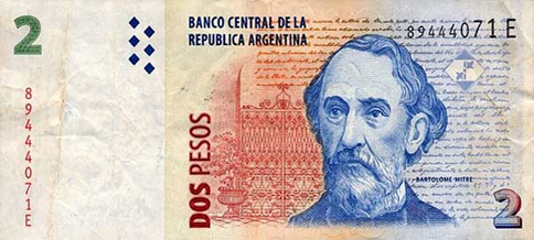 АРГЕНТИНА Если где-нибудь под Москвой начать копать туннель, проходящий через центр земли, то, скорее всего, другой его конец вылезет из земли где-нибудь в Аргентине. Может быть именно этим объясняется сходство темпераментов наших народов? Южная Америка- бушующий континент, пороховая бочка – и по событиям и по темпераменту жителей. Стран там не мало, но, что характерно для всех для них, революции, мятежи и перевороты там совершенно естественное политическое состояние. Эти милитаристские настроения выплескиваются и на денежные купюры – каждый, кто изображен на Аргентинских купюрах обязательно генерал. Можно подумать, что все они там генералы. 2 песо. Бартоламео Митре. (1821-1906). Генерал. На купюре в два песо изображен Бартоломео Митре генерал и политический деятель. Как политический деятель – избирался президентом республики, как генерал – командовал войсками. В истории Аргентины есть забавный случай, связанный с Митре. Когда Аргентина начала формироваться как самостоятельное государ