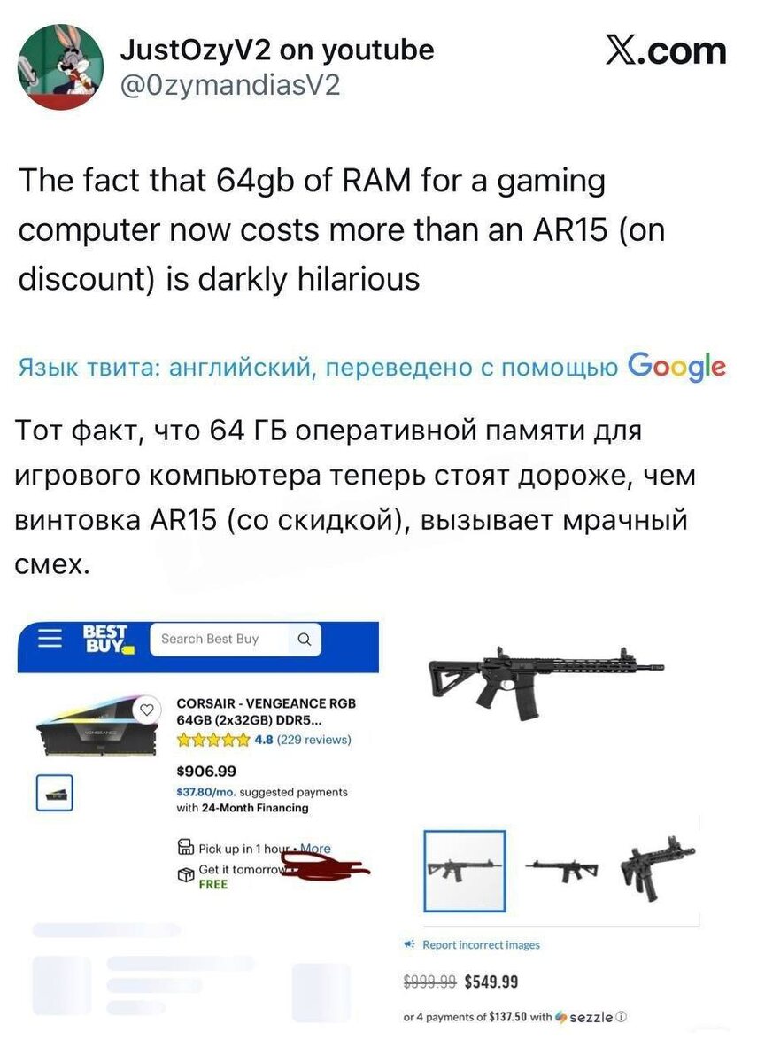 64 Гб оперативы стоят дороже полуавтоматической винтовки в США.
