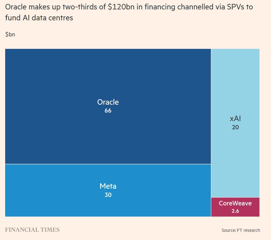 Внебалансовые токсик-кредиты.. Кто-нибудь тут удивлён? «На долю Oracle приходится две трети из $120 млрд финансирования, направленного через специальные холдинговые компании (SPV) для финансирования ЦОДов в сфере ИИ»: Согласно FT, финансовые учреждения, включая Pimco, BlackRock, Apollo, Blue Owl Capital, а также американские банки, такие как JPMorgan, предоставили технологическим группам не менее $120 млрд в виде заемных и собственных средств для развития их вычислительной инфраструктуры. Эти деньги направляются через SPV (Special Supply Company). Поток финансирования, который не отражается в балансах технологических компаний, может скрывать риски, которым подвергаются эти группы, и то, кто окажется в долгах, если спрос на ИИ окажется неудовлетворительным Структуры специальных проектных компаний (SPV) также увеличивают опасность того, что финансовые трудности, с которыми сталкиваются операторы ИИ в будущем, могут непредсказуемым образом распространиться по всей Уолл-стрит. «Восем