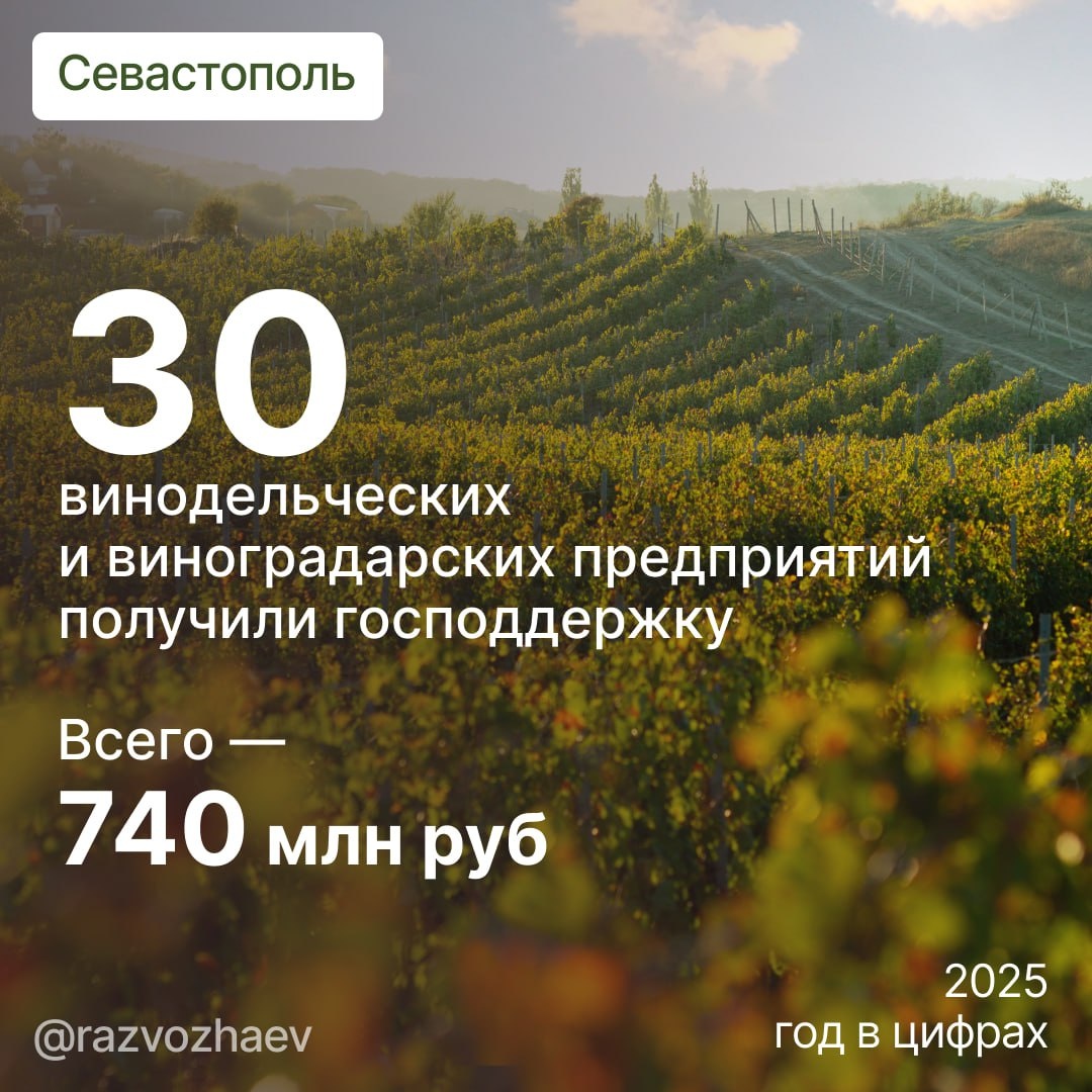 Средства из федерального бюджета мы направили на закладку новых виноградников, приобретение саженцев исключительно российского происхождения, уходные работы, установку шпалер, а также на закупку современного сельскохозяйственного и винодельческого оборудования. Это — реальный вклад в модернизацию производства. Планы на 2026: на поддержку севастопольских виноделов в 2026 году предусмотрено более 500 млн рублей. Государственная поддержка позволит создать новые рабочие места, увеличит приток налогов в региональный бюджет и ещё больше усилит позицию севастопольских вин на российском рынке.