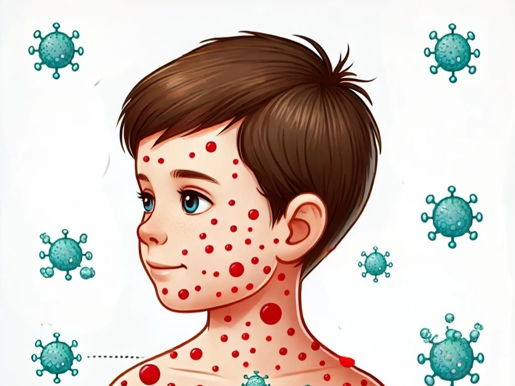 Некоторые проявления ветрянки: Сыпь — начинается с небольших красных пятен, которые через несколько часов превращаются в пузырьки, наполненные прозрачной жидкостью. Со временем пузырьки лопаются, подсыхают и покрываются корочкой.