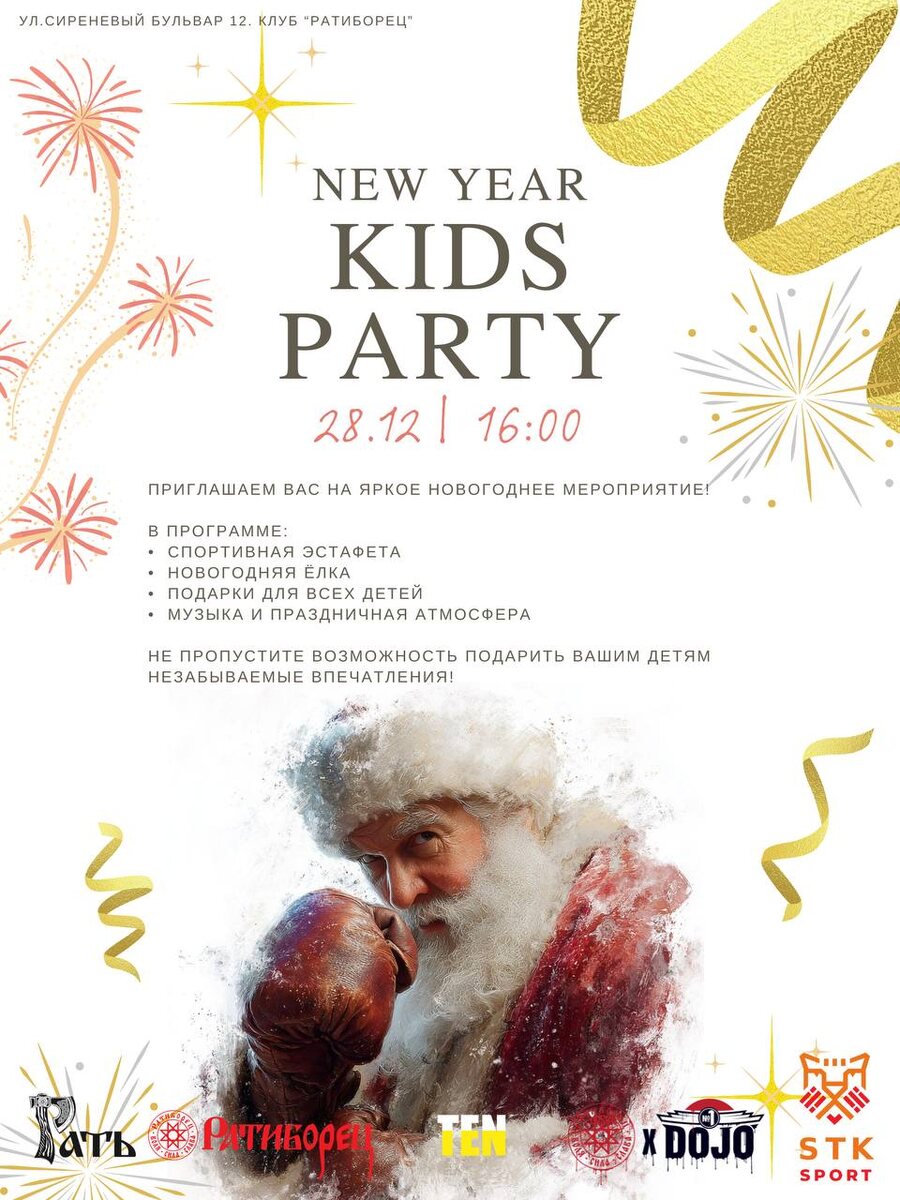 🔥 Мы ждём более 300 детей со всех городов Урала🫶 28 декабря в 16:00 клуб «Ратиборец», Сиреневый бульвар, д. 12🥊 Мы приглашаем вас и ваших детей на большое, яркое и незабываемое предновогоднее мероприятие!🎇 Победители эстафеты получат главный приз! Будет весело, активно и по-настоящему по-новогоднему!🎄