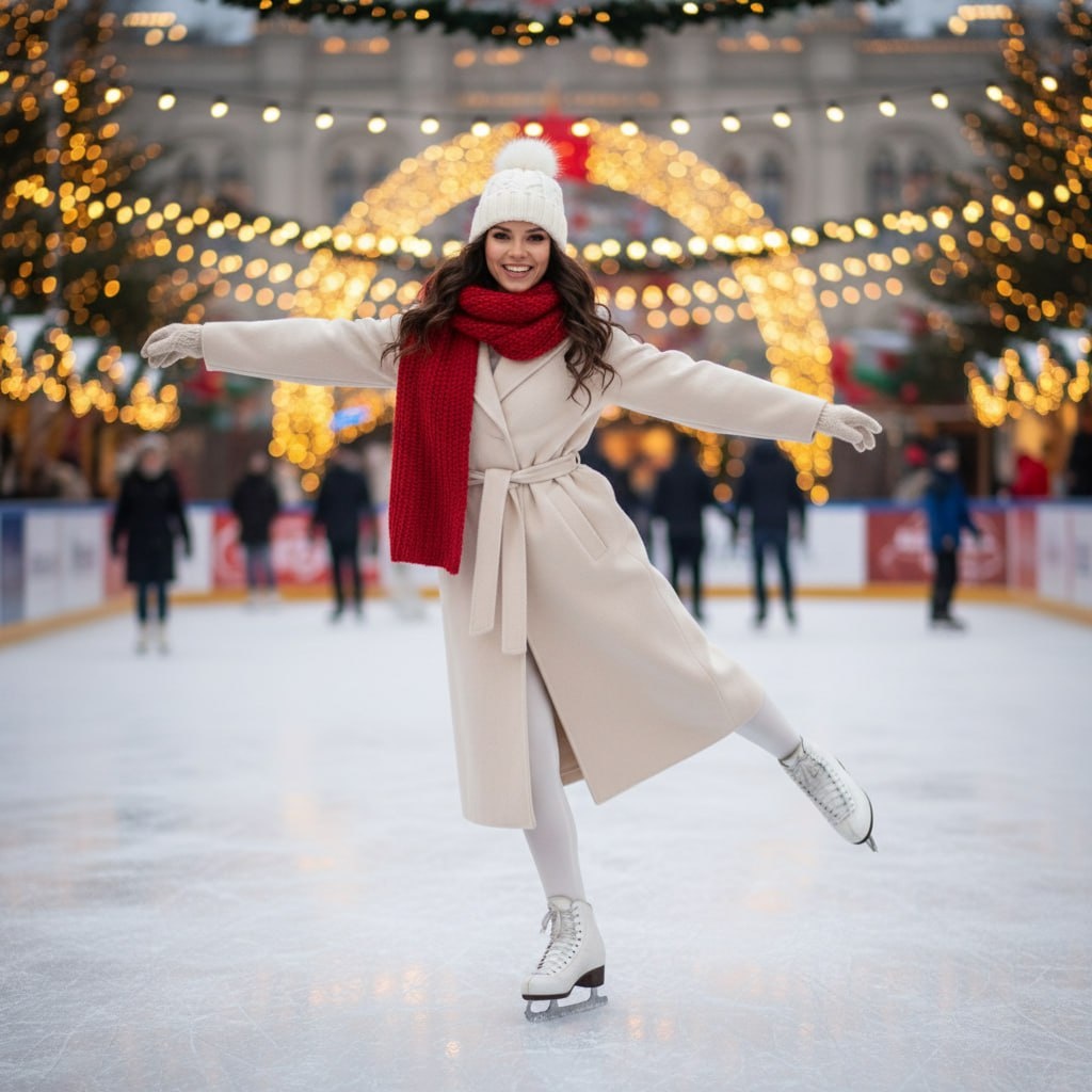 🔥 Превращаем обычное селфи в кадр из дорогого праздничного кампейна. SeeDream идеально держит черты лица, а Nano Banana добавляет ту самую журнальную ретушь и мягкий свет. Пробуем создать зимнюю сказку, где ты — главная героиня на катке. ⚡️ Идеальный вариант для тех, кто хочет обновить ленту уютным лайфстайлом, не замерзая в реальности. 🛑 Using the uploaded selfie as the exact facial reference with 100% identical face match (--face_fidelity 1.0), create a photo from the description while maintaining complete facial likeness. A dynamic full-body shot of a woman (uploaded selfie) gracefully ice skating outdoors in a [festive winter setting]. She has wavy hair flowing beneath a [cozy white knit beanie with a pom-pom]. She is mid-pose, with one leg lifted and arms outstretched for balance, giving a sense of fluid motion. She is dressed in a [thick, oversized baby blue teddy bear coat], a [white turtleneck sweater], and [white leggings]. Her feet are clad in [classic white figure skate