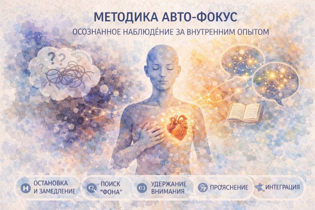 Современный человек живёт в постоянном внешнем фокусе: требования, ожидания, роли, задачи, оценки. Мы привыкаем ориентироваться на «надо», «должен», «правильно», всё реже задавая себе вопрос: что со мной происходит прямо сейчас? Методика авто-фокуса возникает именно как ответ на эту утрату контакта с собственным внутренним опытом. Авто-фокус — это психологическая методика самонаблюдения и саморегуляции, направленная на осознанное переключение внимания с внешних стимулов на внутренние процессы: телесные ощущения, эмоции, мысли, импульсы и едва уловимые состояния. В отличие от анализа или рационального самоконтроля, авто-фокус не предполагает интерпретаций и оценок. Его задача — заметить и удержать внимание на том, что уже присутствует внутри, без попытки сразу это изменить. Методика концептуально близка: Исследования нейропсихологии показывают: когда человек направляет внимание на внутренние ощущения, активируется инсулярная кора и медиальная префронтальная кора — зоны, связанные с само