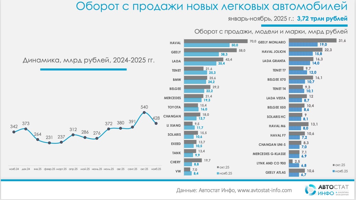 Оборот на рынке новых легковых автомобилей в России по итогам января–ноября 2025 года оценивается «Автостат Инфо» в размере 3,72 трлн рублей. И именно через призму выручки хорошо видно, как рынок смещается от экстремального октябрьского всплеска к более нормальному, но все равно повышенному уровню. Аналитики отмечают, что после слабого старта года (264 млрд рублей в январе, минимум 231–237 млрд рублей в феврале–марте) рынок постепенно «раскачивается». К апрелю оборот поднимается до 312 млрд рублей, затем следует летнее плато в диапазоне 276–391 млрд рублей. Разрыв наступает осенью: в октябре выручка взлетает до 540 млрд рублей – это заметно выше любого месяца 2024 года и максимум за рассматриваемый период. Ноябрь предсказуемо приносит коррекцию до 428 млрд рублей, но даже эта «просадка» означает примерно на четверть больший оборот, чем в ноябре 2024 года (342 млрд рублей). То есть рынок за год не обвалился, а стал более волатильным: резкие пики сменяются мягкими откатами, но базовый у
