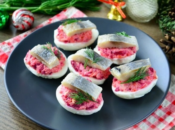 13. Фаршированные яйца "Селёдка под шубой" подавайте к столу сразу после приготовления. Удобная порционная подача понравится каждому гостю.