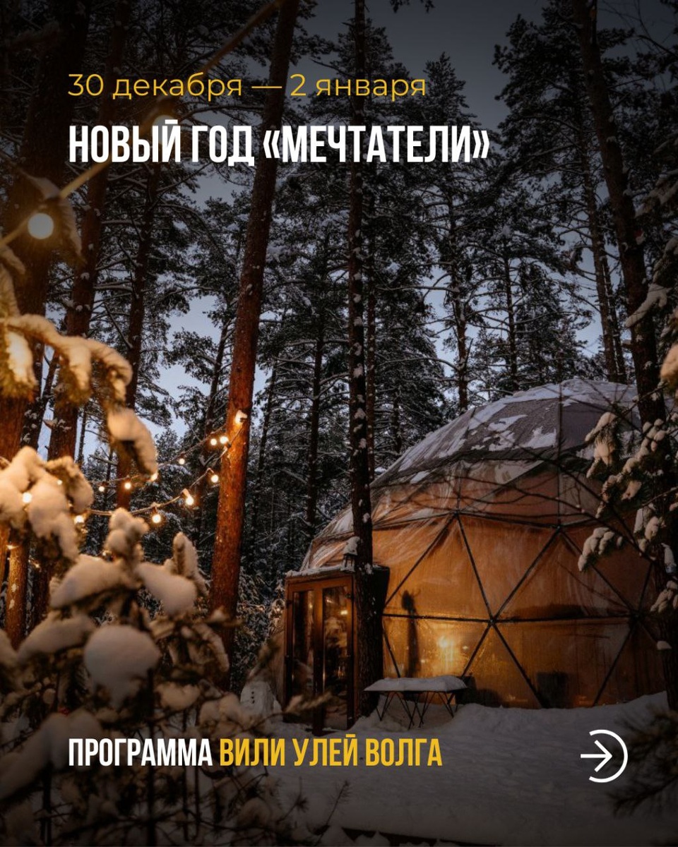 ✨️ 🗓 30 декабря – 2 января 📍Вили Улей Волга Новый год «Мечтатели» Так уж повелось, что самая первая наша локация стала самой ламповой. Когда ты приезжаешь, и буквально слетают оковы. То ли воздух такой сосново-пьянящий, то ли весь лес пронизан атмосферой детства. Нет-нет, и хватаешь ватрушку, чтобы со смехом скатиться с горы❄ Потому и мечтается на Волге легко. Вот так просто и от души. Большие и маленькие, простые и амбициозно смелые желания витают вокруг. Вдруг вы не знаете, о чём мечтать? Или желаний так много, что сложно выбрать? Тогда все на Волгу! В Новый год мы отправимся в настоящее путешествие: вернёмся к маленьким себе, заглянем в эти искренние глаза, полные надежд и восторга, заберём эти мечты в свое взрослое будущее. В карточках — программа, а на сайте ещё больше деталей. Обязательный новогодний стол, бенгальские огни и песни под гитару. Свой настоящий голубой огонёк 🤭 Открыты бронирования от 1 ночи на Новый год и последующие новогодние каникулы. Но будет здорово